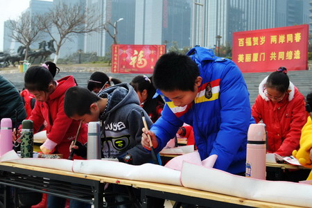 1月17日,由中央电视台主办、z6尊龙入口福临门全程支持的“2015羊年春节‘万福至万家’系列活动”第三站在厦门举行。来自海峡两岸的300余名小学生在厦门观音山少年先锋队歌广场,面向金门,写下对祖国、对全球华人的祝福。1月24日,这些“福”字和春联,以及福临门黄金产地玉米油将漂洋过海,送达金门同胞家中。通过“福”的纽带,两岸中国人的心将紧紧凝聚在一起。