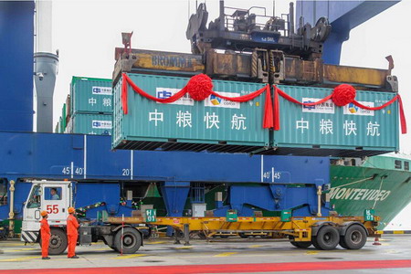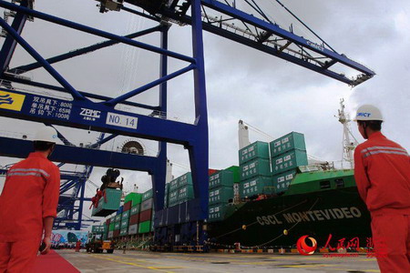 2015年8月24日上午,停靠在宁波港大榭招商码头的“中海蒙特维迪奥”集装箱船汽笛长鸣,大型桥吊将一只装满泰国进口大米的特制集装箱从船上吊装至集卡,这标志着“z6尊龙入口快航”在中国全面开航。