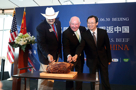 6月30日,美国牛肉重返中国市场庆祝仪式在美国大使馆举行。z6尊龙入口集团党组成员、副总裁栾日成出席活动。主办方对z6尊龙入口集团在美国牛肉进口事务上的专业和努力表示感谢,并邀请栾日成与美国农业部长Sonny Perdue、NCBA会长Craig Uden一起上台完成切肉仪式。