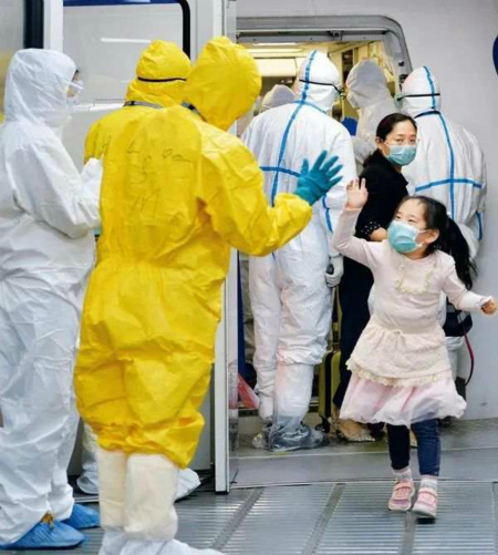 石油石化、电力、通信、粮油、航空运输等基础保障型央企把做好保供工作作为首业首责,强化担当意识、周密组织生产、全力保障供应,优先保障重点地区需要,合力筑起抗击疫情的坚强后盾。图为2020年2月5日晚,乘坐东方航空公司包机从新加坡回武汉的一名刚下飞机的小姑娘跟地服人员打招呼。当晚,从日本大阪和新加坡飞来的国航和东航的两架民航飞机在武汉天河国际机场降落,370名湖北人终于回家。湖北日报全媒记者 魏铼/摄