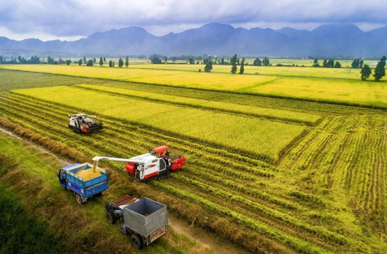 运粮司机邬钢驾驶着满载5吨粮食的卡车驶入浙江省宁波市奉化区振盛粮食现代化农事服务中心,稻谷被倒入进料斗,粮食烘干设备随即根据设置好的数据开启自动作业;广东省台山市水稻进入收割期,广东天禾农资股份有限公司有序组织农机帮助托管农户开展收获作业,确保粮食颗粒归仓;天津市滨海新区世纪田园农机合作社理事长孙敬敏和中塘镇常流庄村村民宋内链一起来到地里,俯下身察看前不久种下的冬小麦长势……