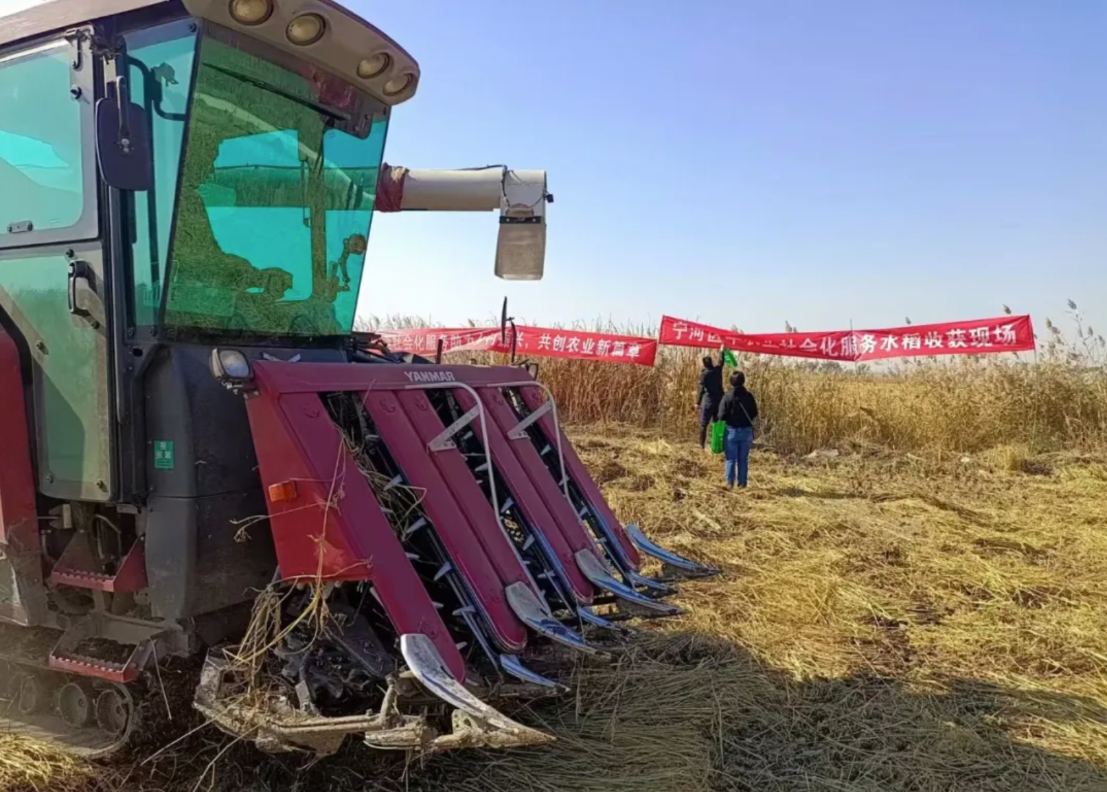 天津宁河区秋粮收获现场,农业社会化服务主体开展机械化作业助力水稻收割。