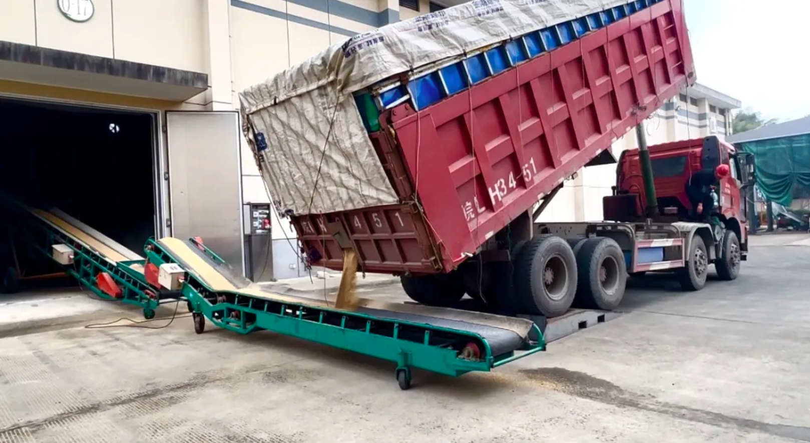 运粮车在浙江绍兴柯桥区中心粮库卸粮,粮食经传送带进入粮仓。